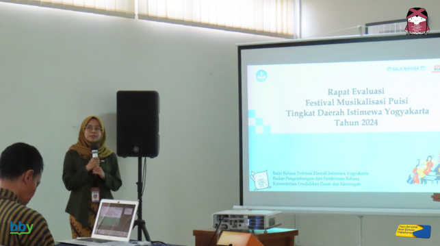 Balai Bahasa Provinsi Daerah Istimewa Yogyakarta (DIY) menyelenggarakan Rapat Evaluasi Festival Musikalisasi Tingkat DIY Tahun 2024 pada Kamis, 12 Desember 2024 di Aula Integritas, Balai Bahasa Provinsi DIY. Kegiatan ini bertujuan untuk mengevaluasi penyelenggaraan program Festival Musikalisasi Tingkat DIY Tahun 2024 serta menyusun rekomendasi sebagai bahan perbaikan program ke depan.
