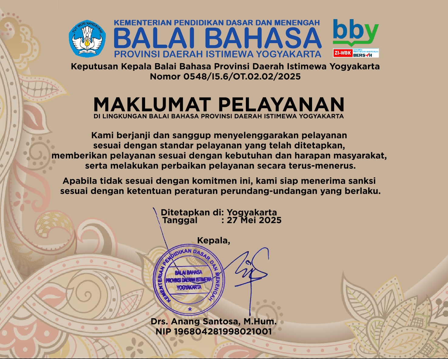 Perjanjian Kinerja Kepala BBY