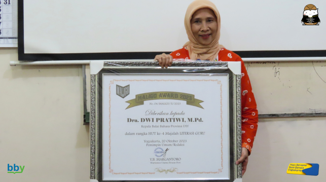 Dalam rangka memperingati HUT ke-4, Majalah Literasi Guru (MALIGU) memberikan MALIGU AWARD 2023 kepada tokoh masyarakat, khususnya di bidang bahasa dan sastra. Kali ini penghargaan diberikan kepada Kepala Balai Bahasa Provinsi DIY, yaitu Dra. Dwi Pratiwi, M.Pd.