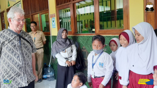 Selesai berbincang dengan pegawai dan mahasiswa magang di Balai Bahasa Provinsi DIY, Pete bersama dengan Kepala Balai Bahasa Provinsi DIY, Dra. Dwi Pratiwi, M.Pd., beserta tim melaksanakan kunjungan ke SD Muhammadiyah Karangkajen. Saat kunjungan tersebut, Pete mengajak para siswa SD Muhammadiyah Karangkajen berbincang dengan menggunakan bahasa Jawa sembari belajar bahasa Jawa.