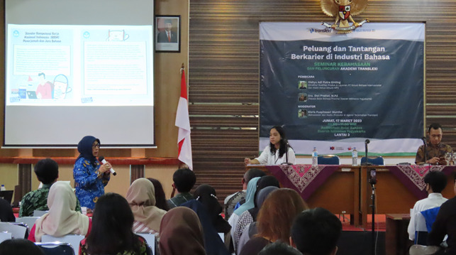 Seminar kebahasaan “Peluang dan Tantangan Berkarier di Industri Bahasa” digelar di Auditorium Lantai 3 Balai Bahasa Provinsi Daerah Istimewa Yogyakarta, Jumat (17/3/2023). Seminar yang merupakan kegiatan kolaborasi antara Akademi Translexi dan Balai Bahasa Provinsi DIY ini menjadi ajang temu para bahasawan se-DIY baik akademisi, penerjemah, mahasiswa program studi bahasa dan sastra, dan masyarakat peminat industri bahasa untuk berdiskusi mengenai karier di industri bahasa, khususnya di bidang penerjemahan.