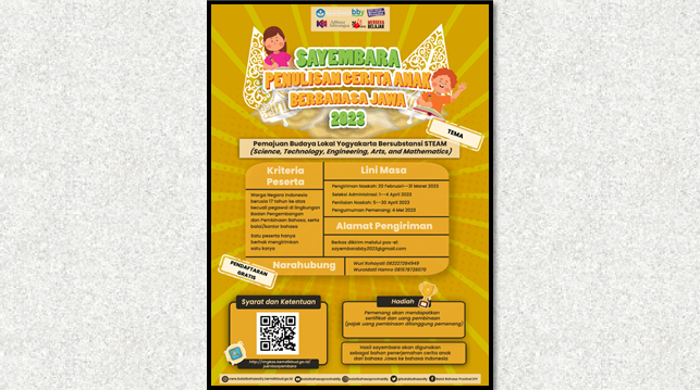 Balai Bahasa Provinsi Daerah Istimewa Yogyakarta pada 2023 menyelenggarakan Sayembara Penulisan Cerita Anak Berbahasa Jawa. Sayembara ini bertujuan untuk menyeleksi naskah bahan penerjemahan untuk menghasilkan produk penerjemahan sebagai pendukung diplomasi bahasa Indonesia.